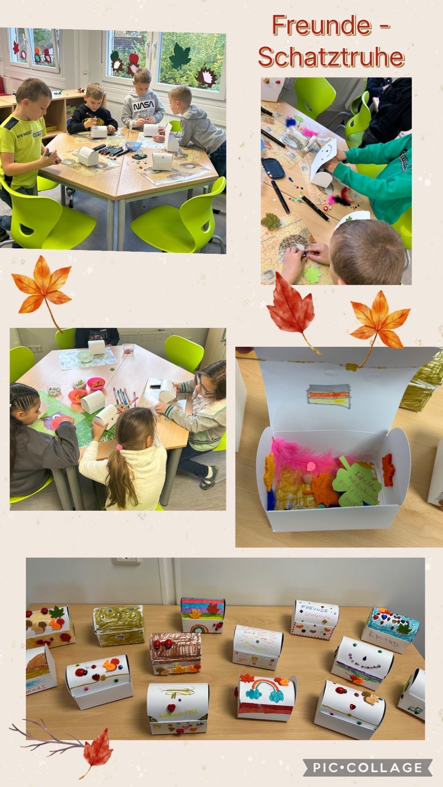 Die Kinder der OGS Oesterweg-Hesselteich haben sich in den Herbstferien mit dem Thema „Freundschaft“ beschäftigt. „Freunde zählen zu den wichtigsten Menschen der Welt!“ Darin sind sich alle Kinder einig, Freunde spielen und lachen zusammen, teilen Geheimnisse, helfen sich gegenseitig und sagen, dass sie sich gern haben. Zusammen gestalten sie ein Freundschaft-Plakat für die OGS. Für die/den beste(n) Freund(in) haben die Kinder mit viel Liebe und nach ihren eigenen Vorstellungen eine Freunde-Schatztruhe gebastelt. In die Schatztruhe kamen selbst gemachte kleine Geschenke, wie Armbänder, Anhänger, kleine Briefe und Vieles mehr. Eine rundum gelungene Herbstferienwoche 🙂