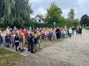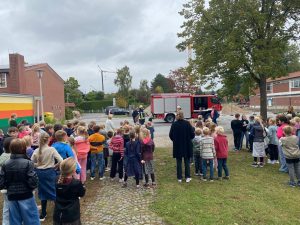Am 17. September 2025 ertönte ein Feueralarm an beiden Schulstandorten. Alle Klassen verließen das Schulgebäude und versammelten sich draußen, wo sie mit einem ,,tatütata“ von der Feuerwehr begrüßt wurden. Diese kontrollierte im Schulgebäude unter anderem, ob alle Fenster und Türen verschlossen waren – und konnte alle Kinder anschließend mit Hilfe des Megaphons loben! Diesen Probe-Feueralarm haben wir mit der Feuerwehr Versmold erfolgreich gemeistert.